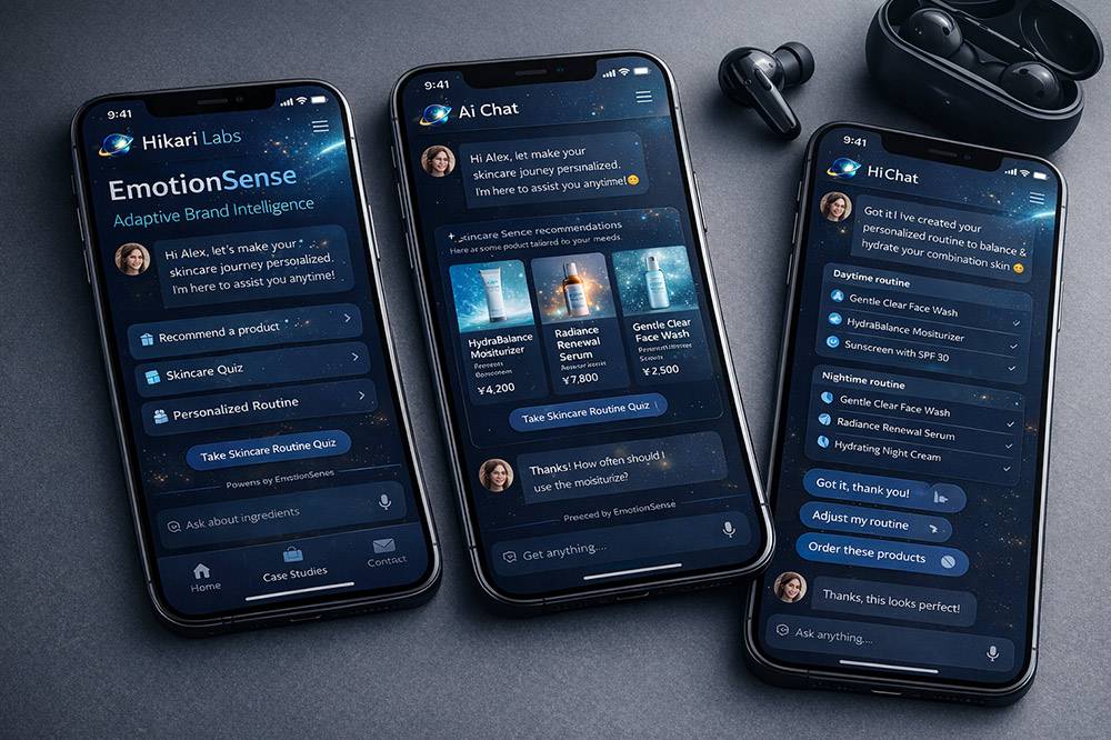 EmotionSense transformed Hikari Labs’ brand from static messaging into a living, adaptive experience. Using behavioral intelligence and AI, the system adjusted content, visuals, and interactions in real time based on user intent and emotional signals. The result was a brand that felt responsive, human, and deeply engaging across devices.